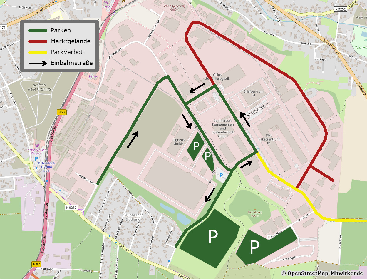 Bitte im Gewerbegebiet so weit fahren, bis Euch eine Parklücke vom THW zugewiesen wird! Vorher nicht die Nerven verlieren, auch wenn Markt, Schnäppchen und Wetter locken.