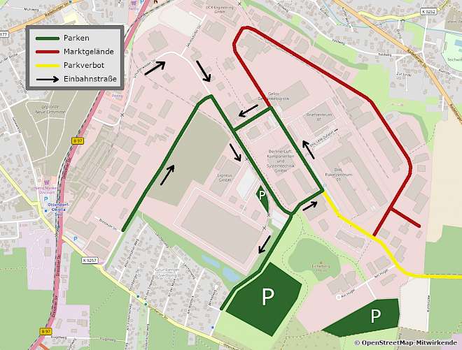 Bitte im Gewerbegebiet so weit fahren, bis Euch eine Parklücke vom THW zugewiesen wird! Vorher nicht die Nerven verlieren, auch wenn Markt, Schnäppchen und Wetter locken.